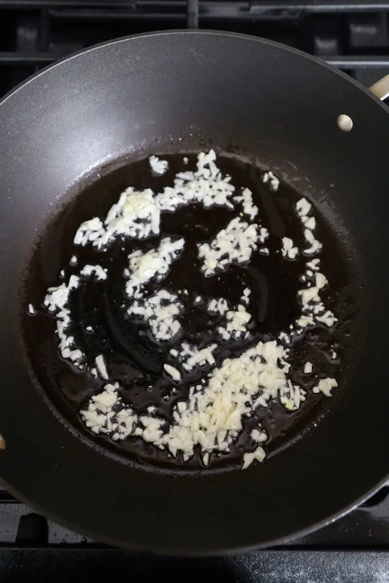 After 30-50 seconds the oil should be heated, then move to add minced 2-3 garlic cloves. Stir the garlic for about 30 seconds. Stringing frequently ensures the even browning of garlic.