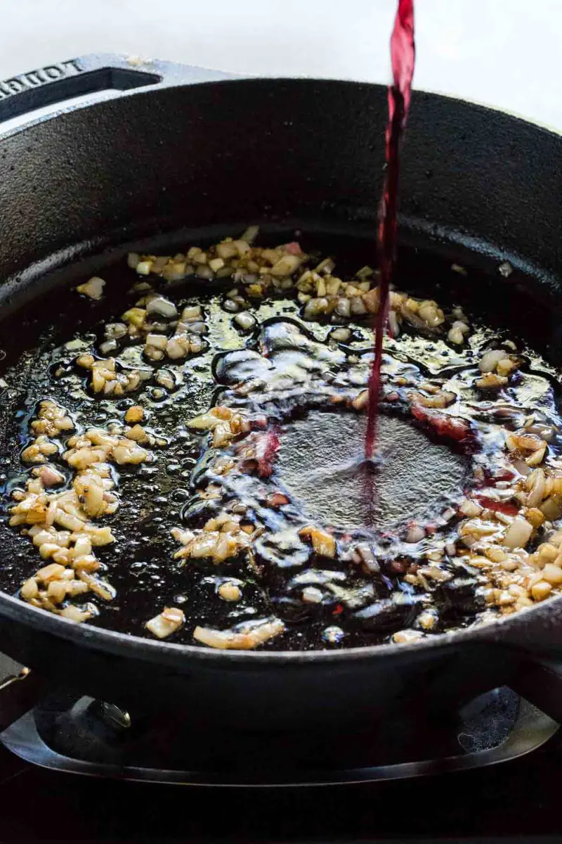 Simmer the red wine for about 1-2 minutes. By that time, the wine reduces to half and turns into a slightly thick paste. This paste contains nuanced flavors of garlic, olive oil, and onion (if added).