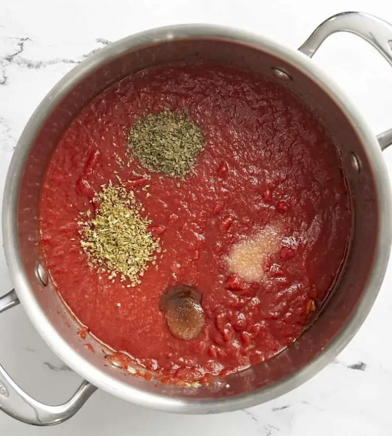 These aromatics are the star of the marinara sauce. Use 1 teaspoon of dry oregano and 2-3 fresh basil leaves to add a refreshing fragrance to the sauce.