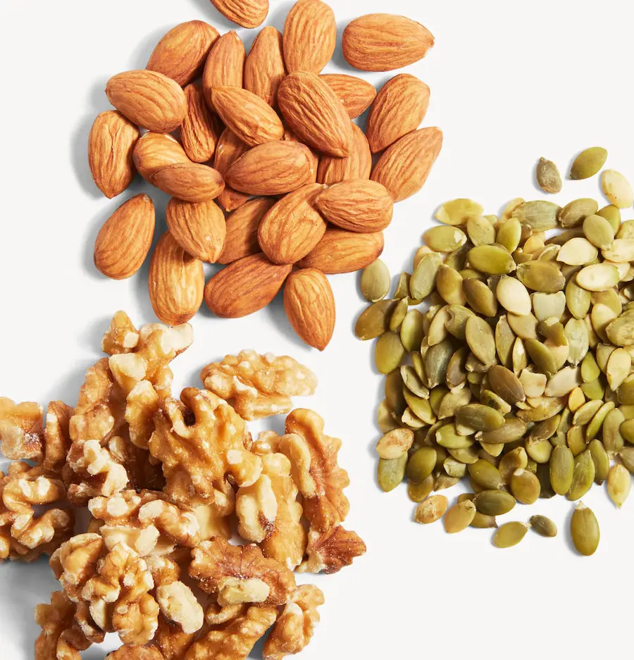 Common nuts include almonds, walnuts and cashews, all of which are rich in fiber, protein, and healthy fats. Similarly, common seeds to incorporate in your diet are chia seeds, flaxseeds and pumpkin seeds.
