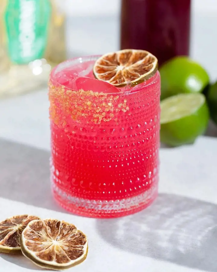The hibiscus syrup is mixed with the margarita ingredients and ice and served with the classic salted rim. This cocktail has a pretty pink color thanks to the raspberry hue and floral flavor from dried hibiscus flowers.