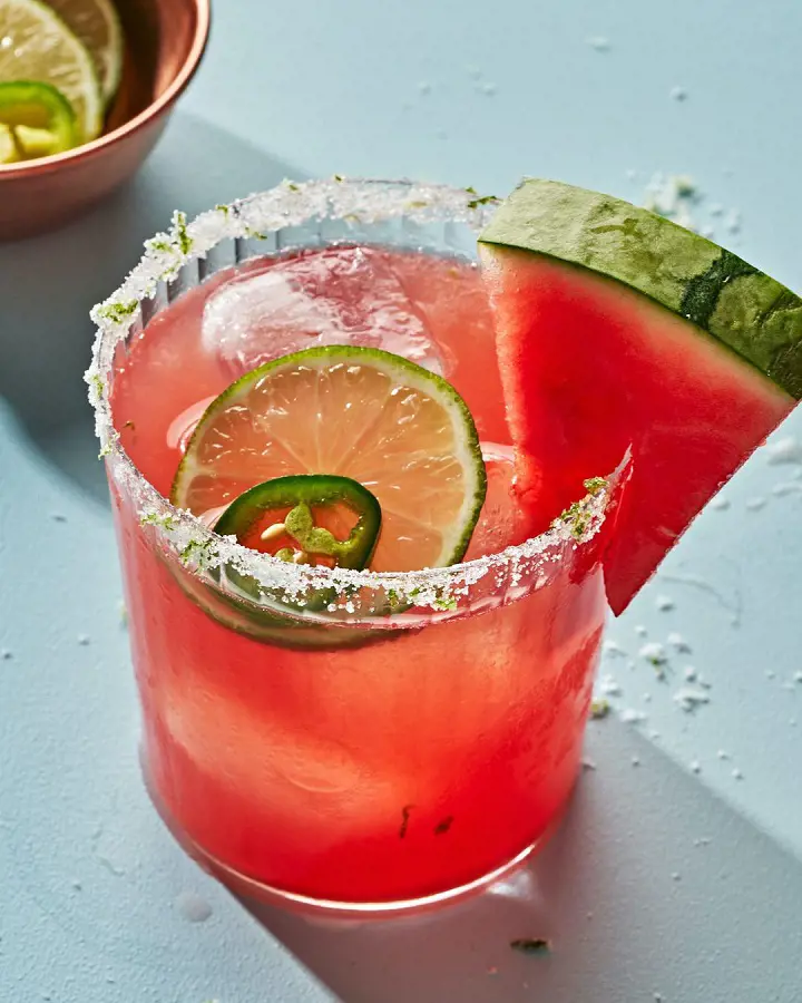 A salted and spiced watermelon margarita combines all the magical elements of a classic margarita with fresh jalapeños and watermelon juice. The spicy kick from the jalapenos enhances the sweet watermelon and the tangy margarita base.