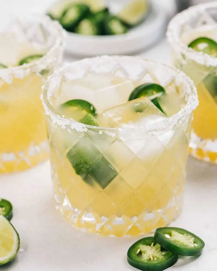There is nothing quite like a spicy jalapeno margarita recipe when you are feeling a little feisty. This drink is spicy, tart, slightly sweet, and refreshing over ice. It is made with jalapeno-cucumber tequila, fresh lime juice, and orange juice.