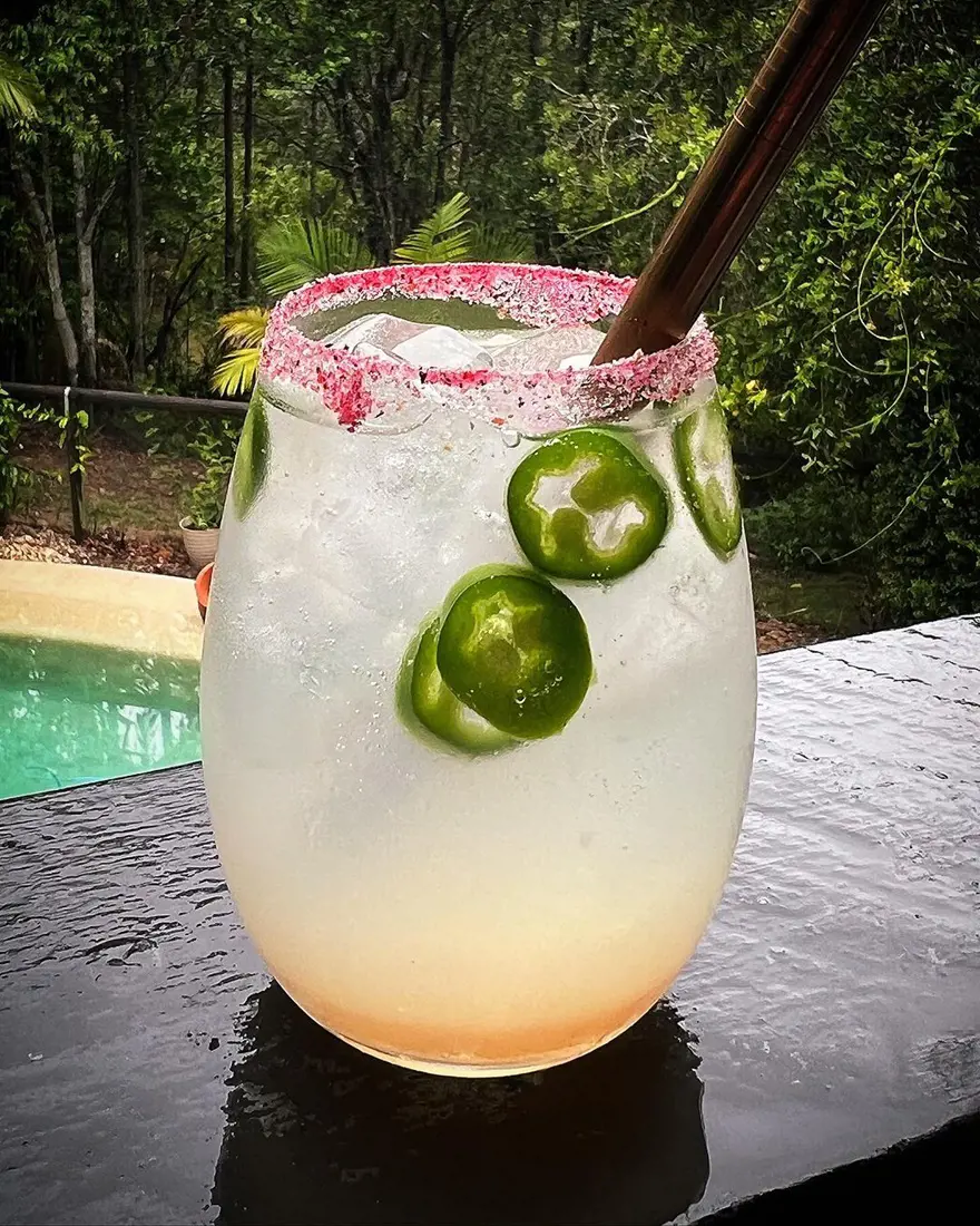 Muddled jalapeño slices are used in the drink to release their spicy flavor. Additionally, the glass is rimmed with chili salt (optional) for an extra kick.