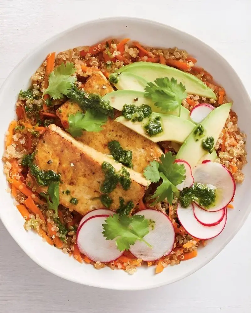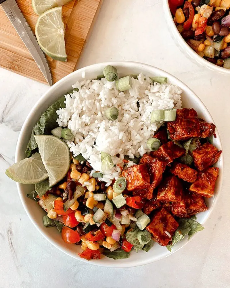 Tex-Mex Tofu and Quinoa Bowl invites you to indulge in a symphony of Southwestern flavors. Picture protein-packed tofu, light and fluffy quinoa, and a vibrant array of vegetables, all coming together in a delightful dance of varied textures and tastes.