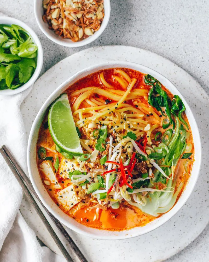 Steam or boil an assortment of veggies, such as carrots, bok choy, and broccolini, to infuse the soup with vibrant colors and essential nutrients. Elevate the experience with garnishes like a zesty lime wedge, crisp bean sprouts, fresh coriander, crushed roasted peanuts, and crispy fried shallots.