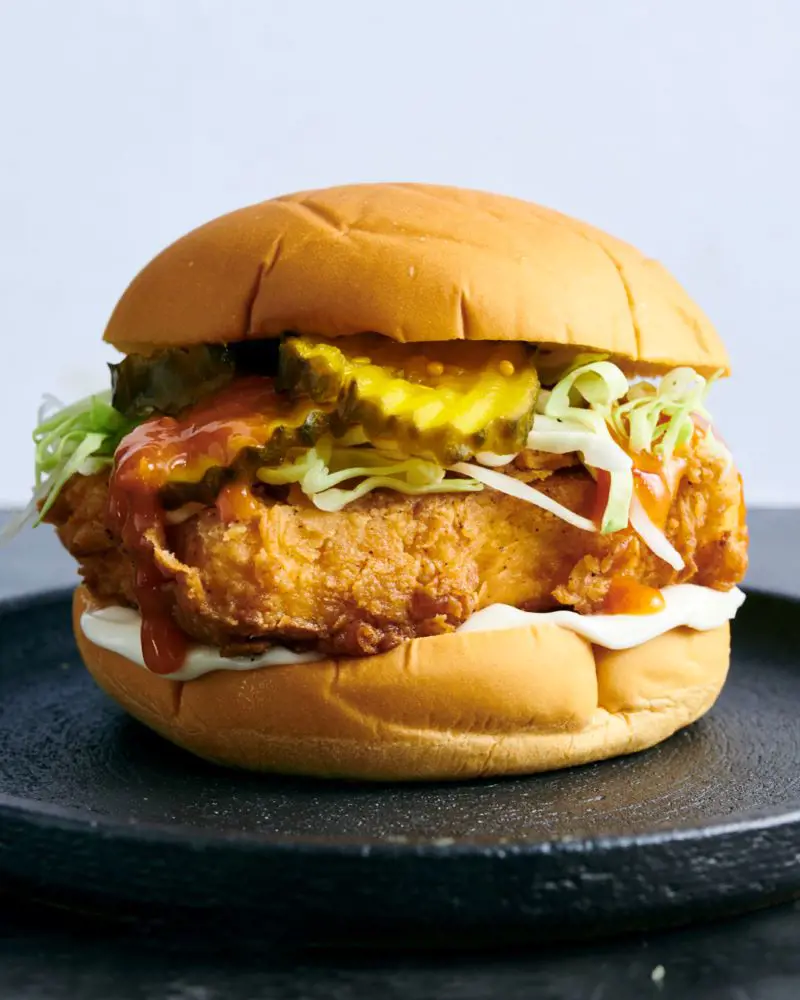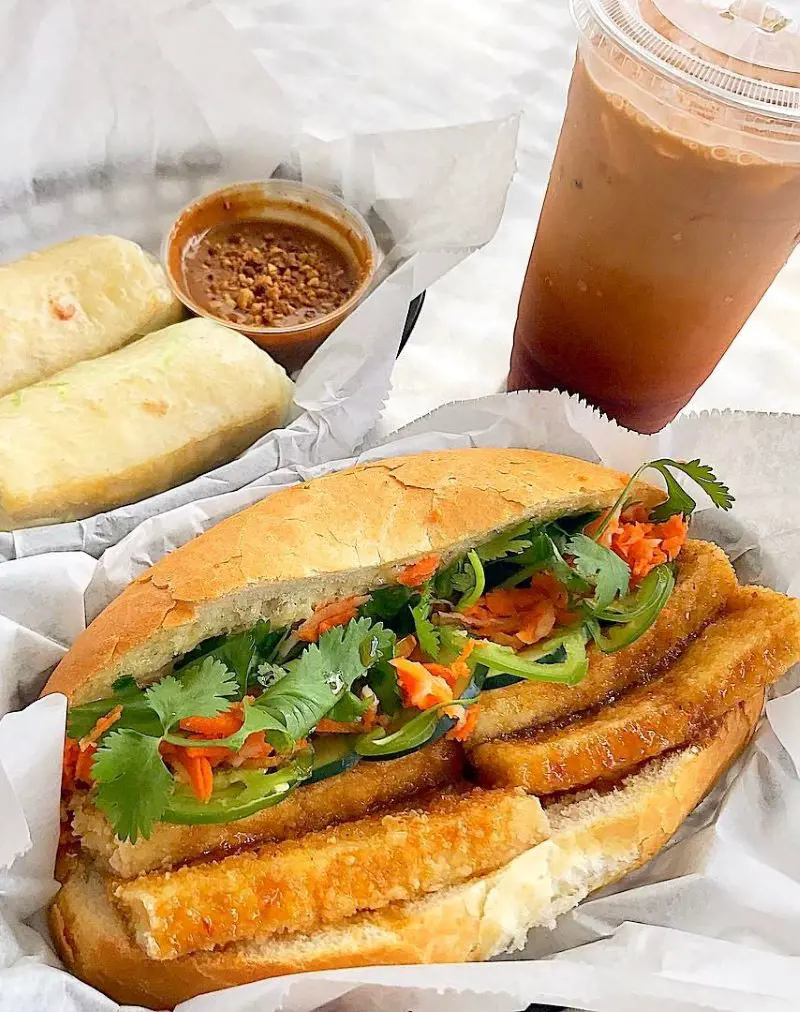 Delight in a Crispy Fried Tofu Sandwich, a delectable fusion of textures and flavors. Golden and crunchy tofu takes center stage, nestled between soft bread and complemented by vibrant toppings.