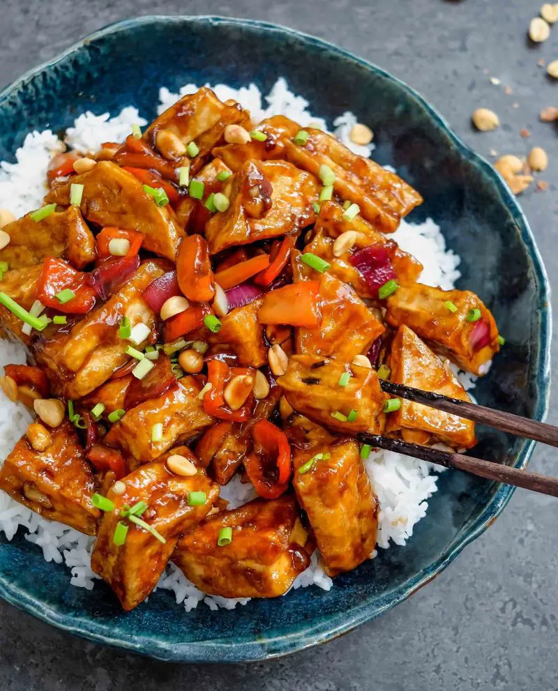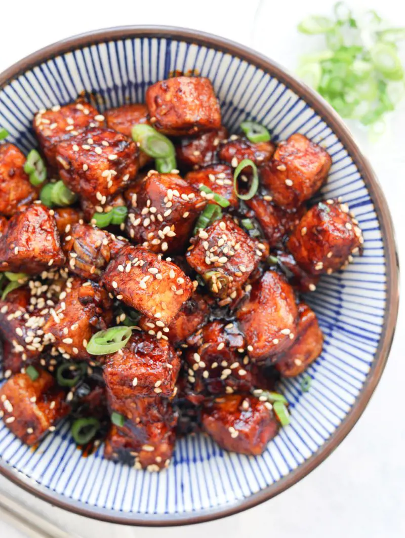 Crispy Soy Garlic Tofu, a vegan masterpiece, elevates firm tofu into a culinary delight. Each bite boasts a satisfying crunch, as the tofu cubes are expertly coated and infused with a harmonious blend of savory soy sauce and rich garlic flavor.