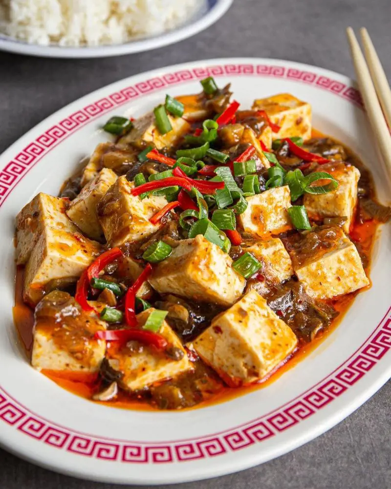 A delightful twist on the classic Sichuan dish, Mushroom Mapo Tofu features a savory and spicy tofu stew enriched with the robust flavor of mushrooms. This vegan rendition maintains the dish's signature boldness by incorporating a medley of mushrooms, creating a satisfying umami depth.