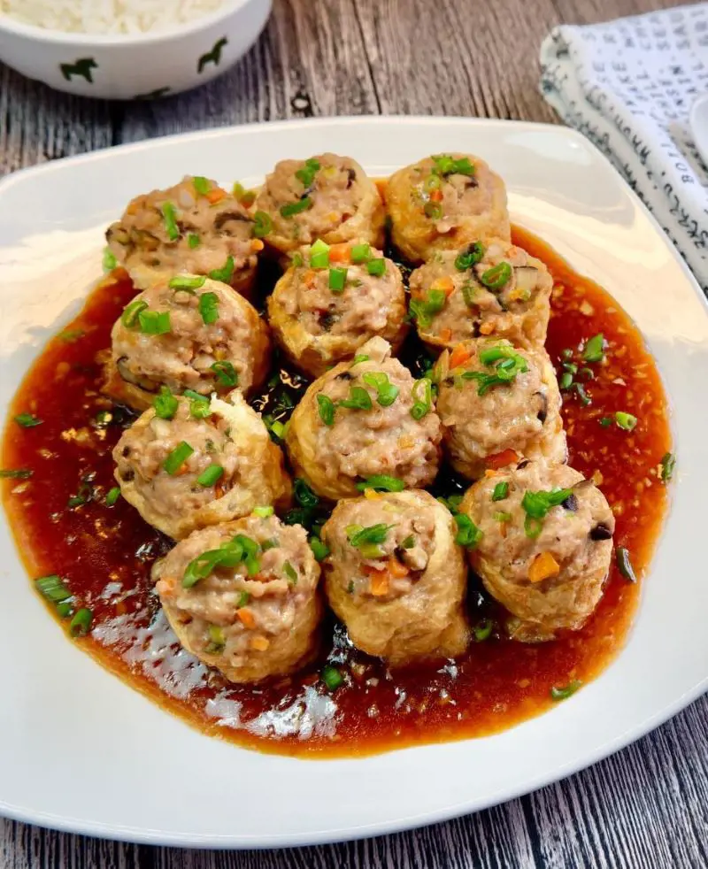 Delight in the exquisite simplicity of Steamed Stuffed Tofu Puffs, a culinary creation that merges the lightness of tofu with delectable stuffing. These pockets of joy are steamed to perfection, ensuring a tender texture that complements the flavorful filling.