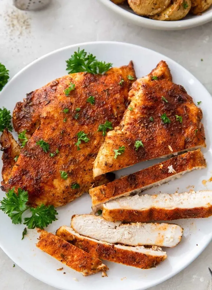 Like pork chops, chicken is a good source of protein. 85 grams of cooked, boneless, and skinless chicken breast contains 26 grams of protein. Protein is essential for maintaining cell health as well as its growth and development.