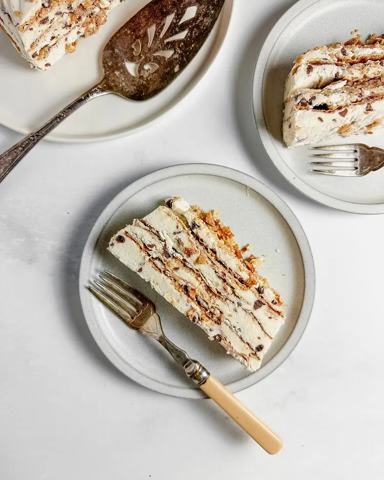Thus, leave this cake in the refrigerator overnight so that cookies can absorb some moisture from the cream making it soft and creamy enough to cut into slices when served.