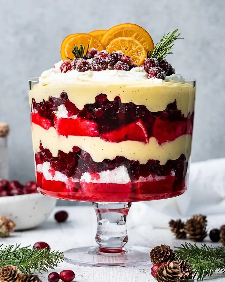Fresh fruits like berries and peaches add sweetness to the juicy touch, while the rich creamy custard provides richness in a velvety texture. It is topped with the final fluffy whipped cream, which gives lightness to the trifle.