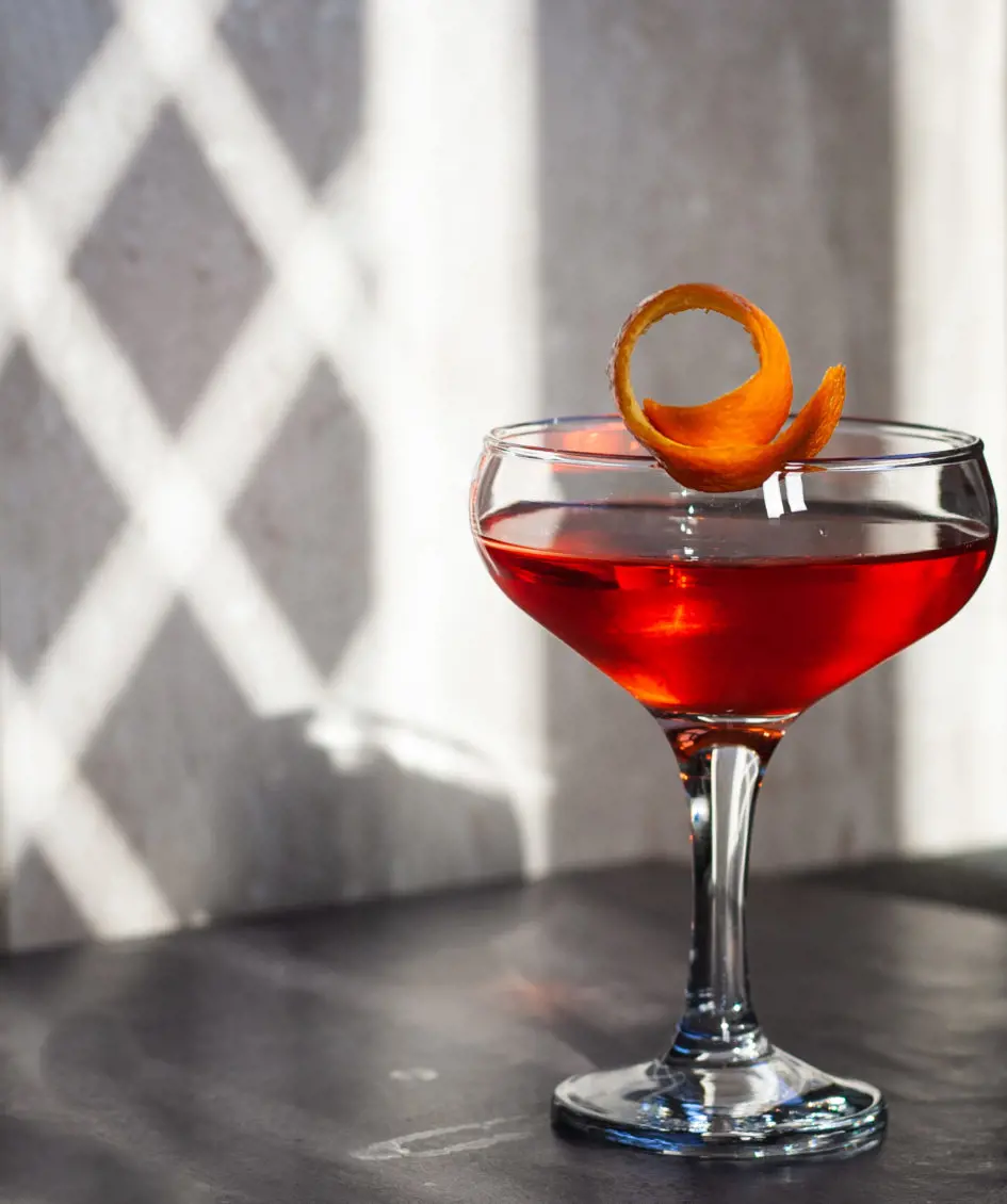 Stir the ingredients for about 30 seconds to achieve a well-chilled and harmonious blend. Strain the mixture into a chilled rocks glass filled with ice, unveiling a captivating deep-red hue. You may also express the oils from an orange peel over the drink to add a citrusy aroma.