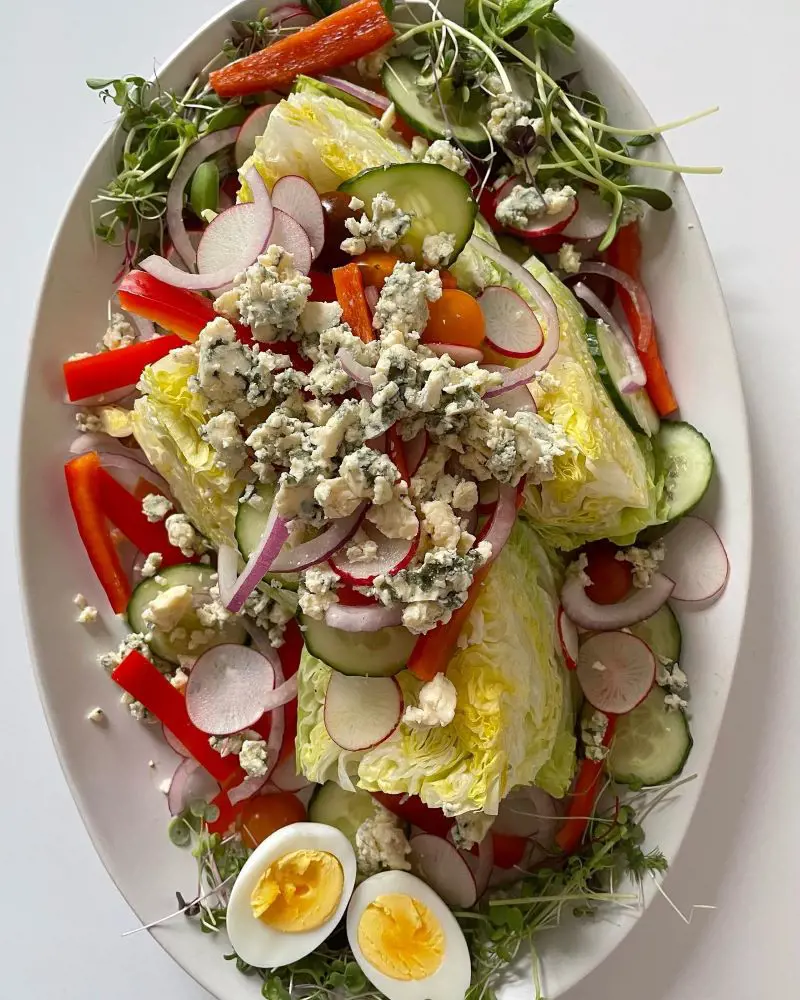 Crisp iceberg lettuce serves as the foundation for this Classic Wedge Salad, accompanied by red peppers, cherry tomatoes, cucumber, radish, and red onions. Blue cheese and bacon contribute richness, while a perfectly boiled egg adds protein.