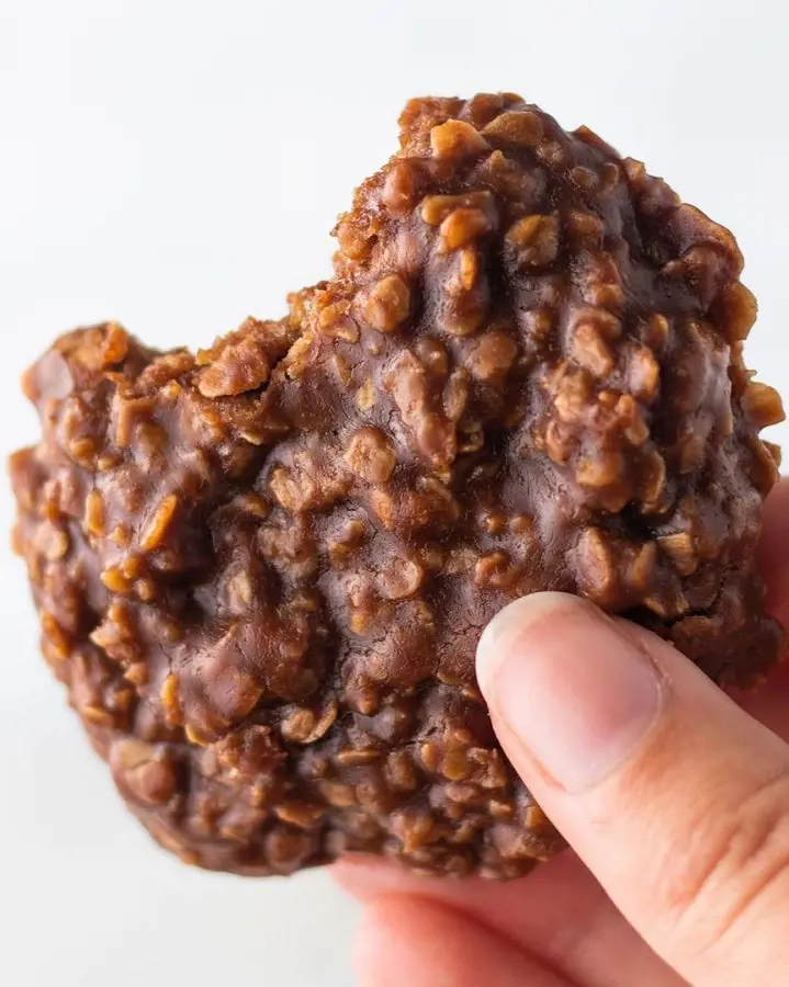 All you have to do is stand by the stove and stir the cookie mixture containing coconut oil, peanut butter, syrup, cocoa powder, vanilla extract, salt, and rolled oats. You can taste-test and adjust the flavor according to your liking.