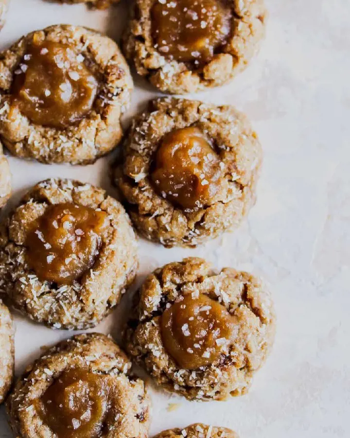 You can use ghee or coconut oil as the fat that binds all the wet and dry ingredients together. It results in the best-tasting cookie with the best texture. Once the cookie is baked, top it off with sea salt and caramel sauce. The trifecta is absolutely to die for.