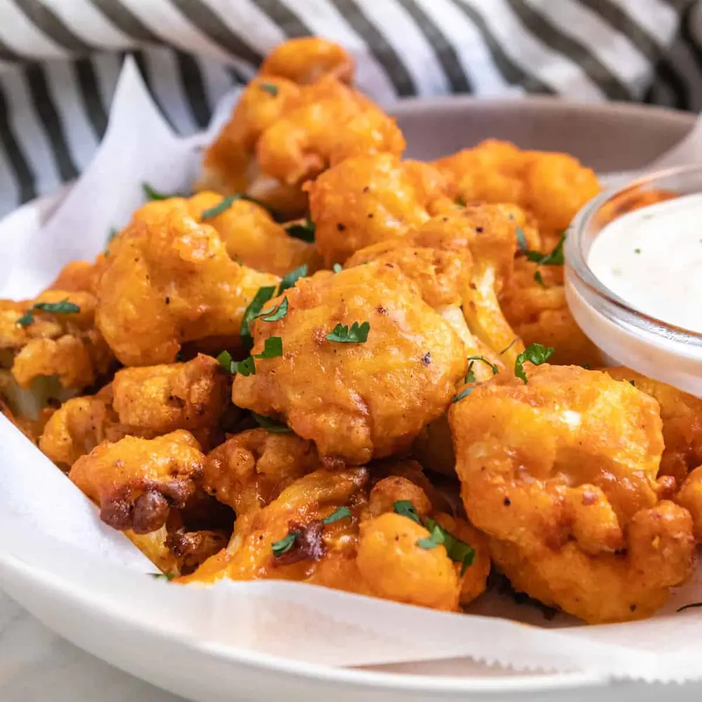 The cauliflower is coated with the bold buffalo sauce, serving heat as well as tang.