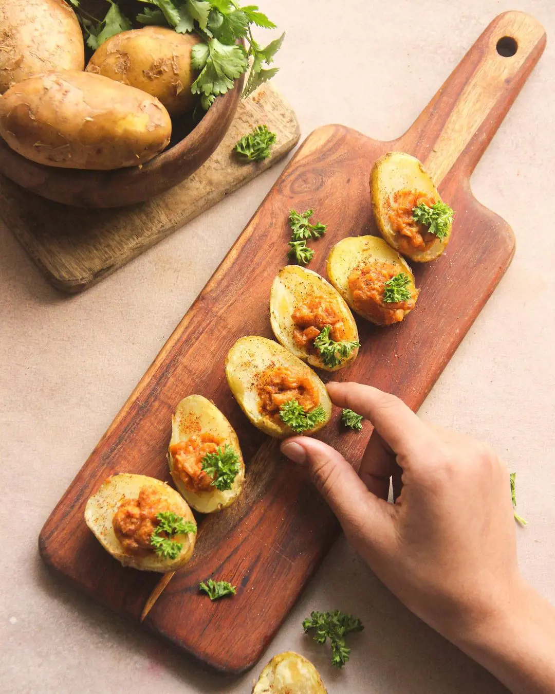 Deviled potatoes are the perfect vegetarian version of the deviled eggs. Things you have to consider while making this dish are the selection of potatoes and the filling. Opt for baby potatoes that are halved and scooped out. These golden gems, like edible vessels, are then filled with a luscious blend of mashed potato, mayo, mustard, and spices