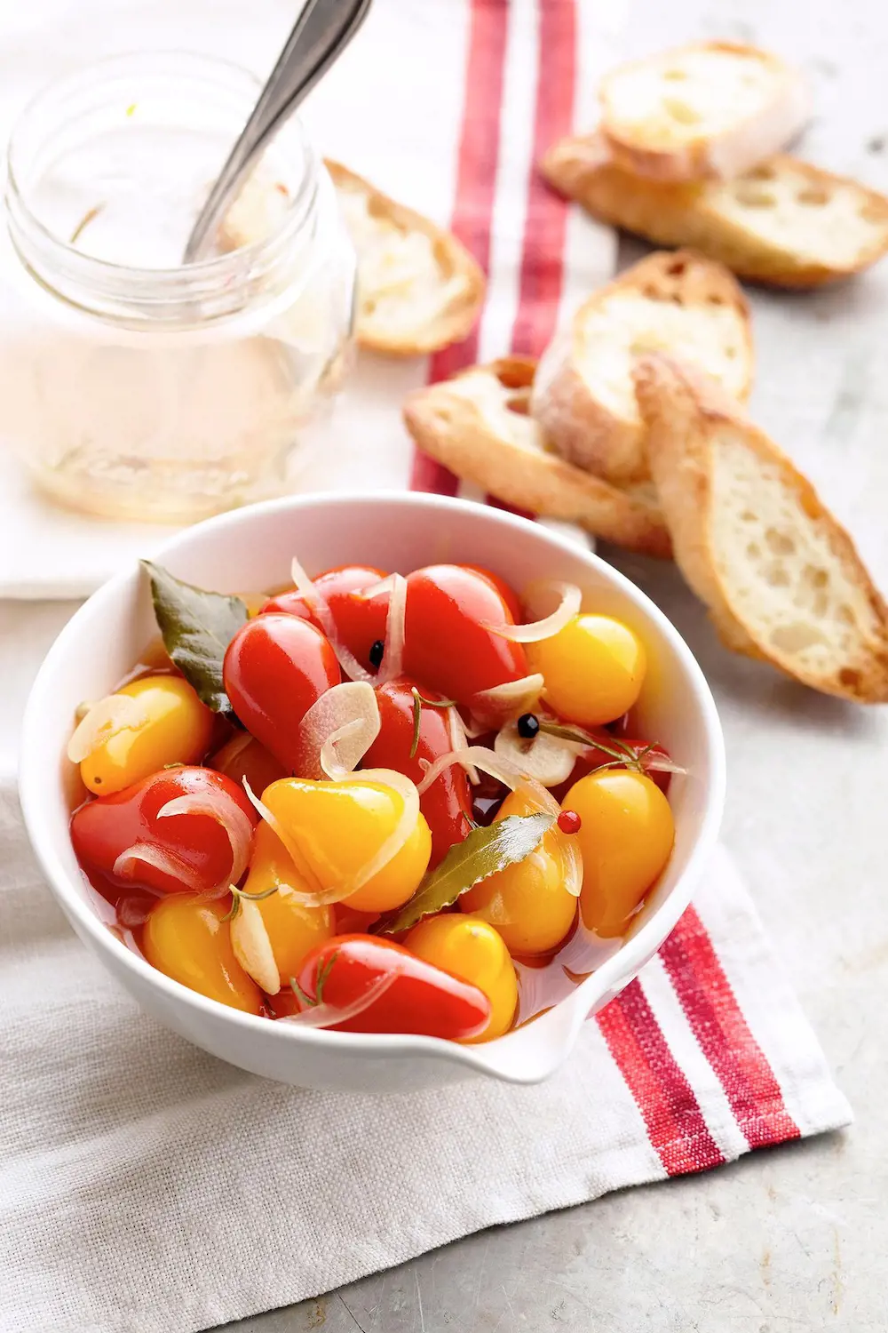 If you're looking for something quick and easy to make, pickled tomatoes are the way to go. In this dish, juicy tomatoes are brined in vinegar, herbs, and spices. Served as a standalone appetizer or as part of a veggie platter, pickled tomatoes add a punch of acidity and brightness.