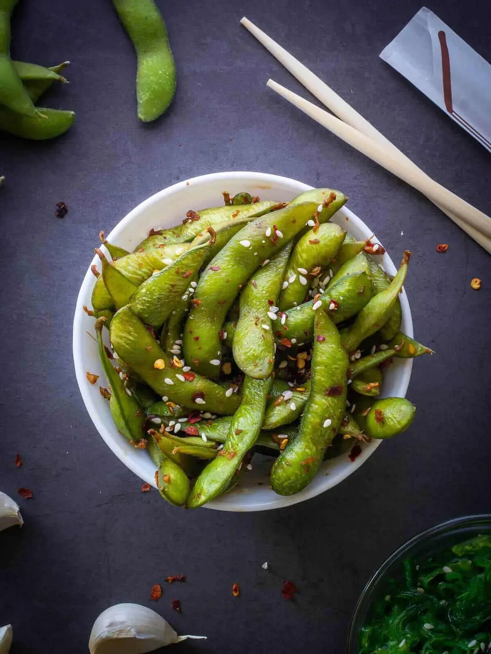 In this dish, edamame is dipped in a savory sauce made with soy sauce, mirin, garlic and some honey. These young soybeans then hit the pan where the glaze caramelizes to form umami flavors. Each pod becomes a burst of flavor, a delightful pop of satisfaction with every nibble.