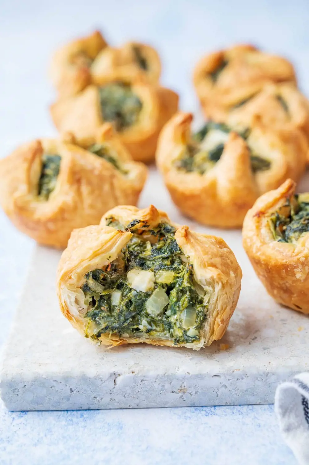 These are a testament to the transformative power of puff pastry, enveloping a vibrant mixture of spinach, cheese, and aromatic seasonings. Baked to a golden brown, each bite unveils layers of buttery, flaky goodness complemented by the earthiness of spinach.